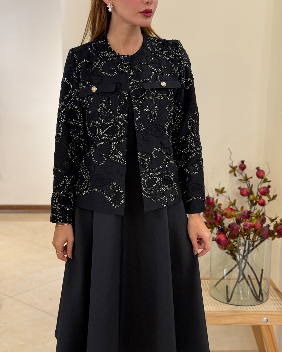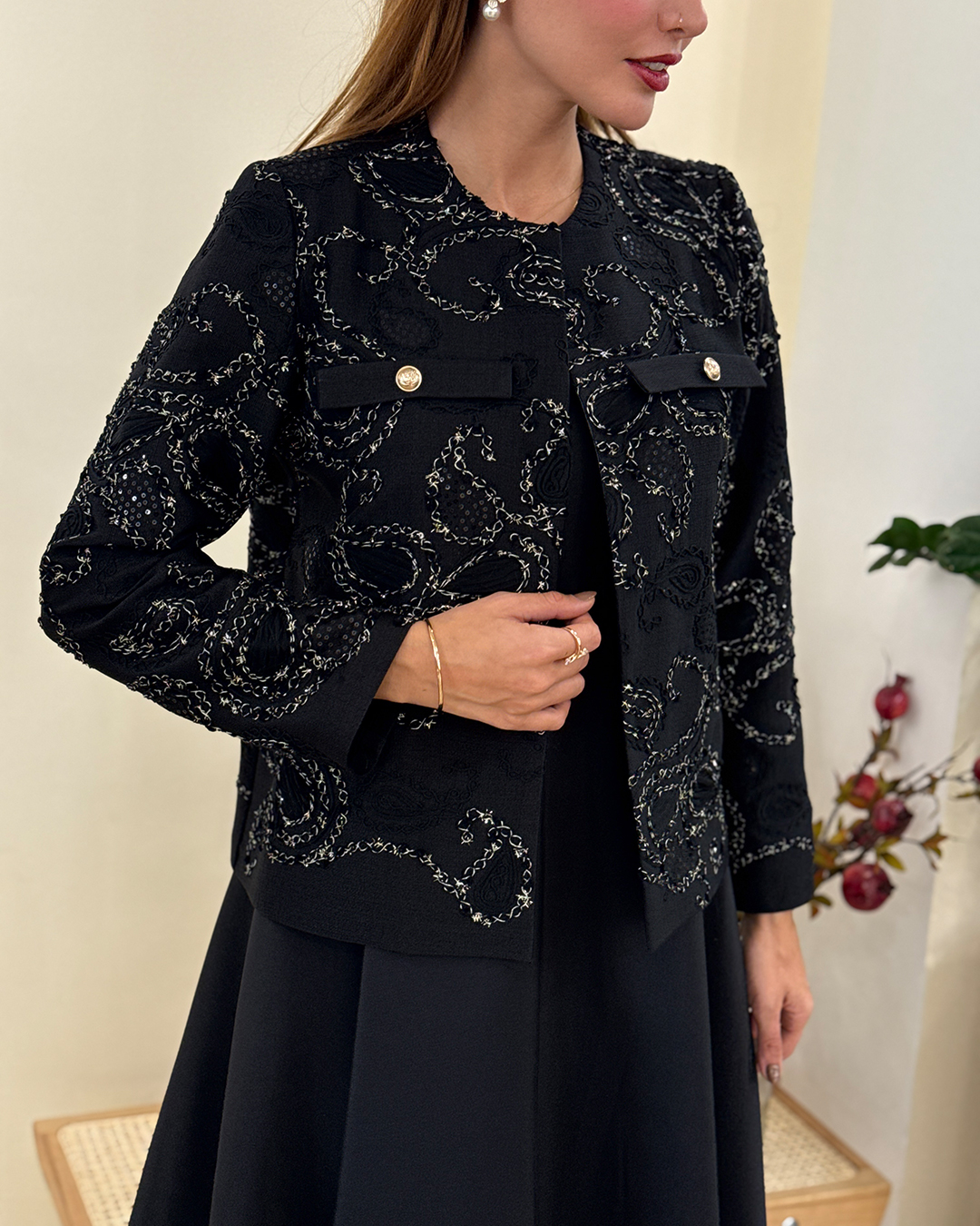 کتی با پترن اصیل ایرانی که ظرافت زنانه را به خوبی نشان می‌دهد. دو جیب طراحی شده‌ی روی این لباس کمی جلوه‌ی رسمی‌تر به آن بخشیده است. استایل کردن این کت بسیار ساده است و پیراهن ساتن ساده در زیر این کت، پیشنهاد گالری نیلوفر شهرابی به شماست.