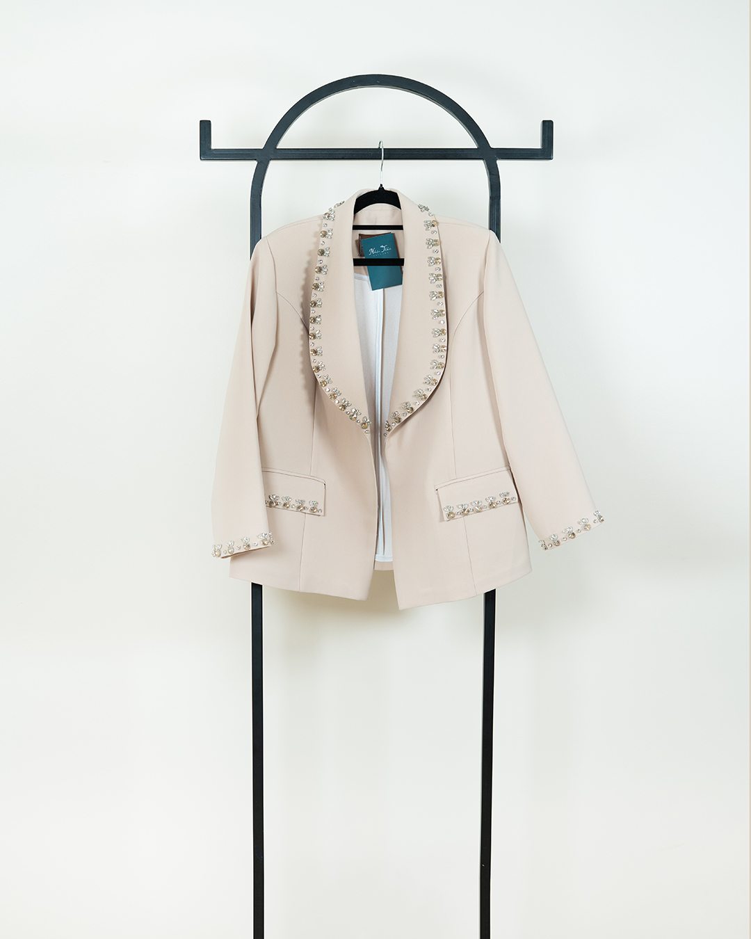 این کت زیبا جواهردوزی شده در عین سادگی، استایلی بسیار چشمگیر و جذاب به شما می‌بخشد. این کت با ترکیب یک کفش نوک تیز و شلواری راسته یا دمپا گشاد، بسیار خانمانه و شیک می‌شود.