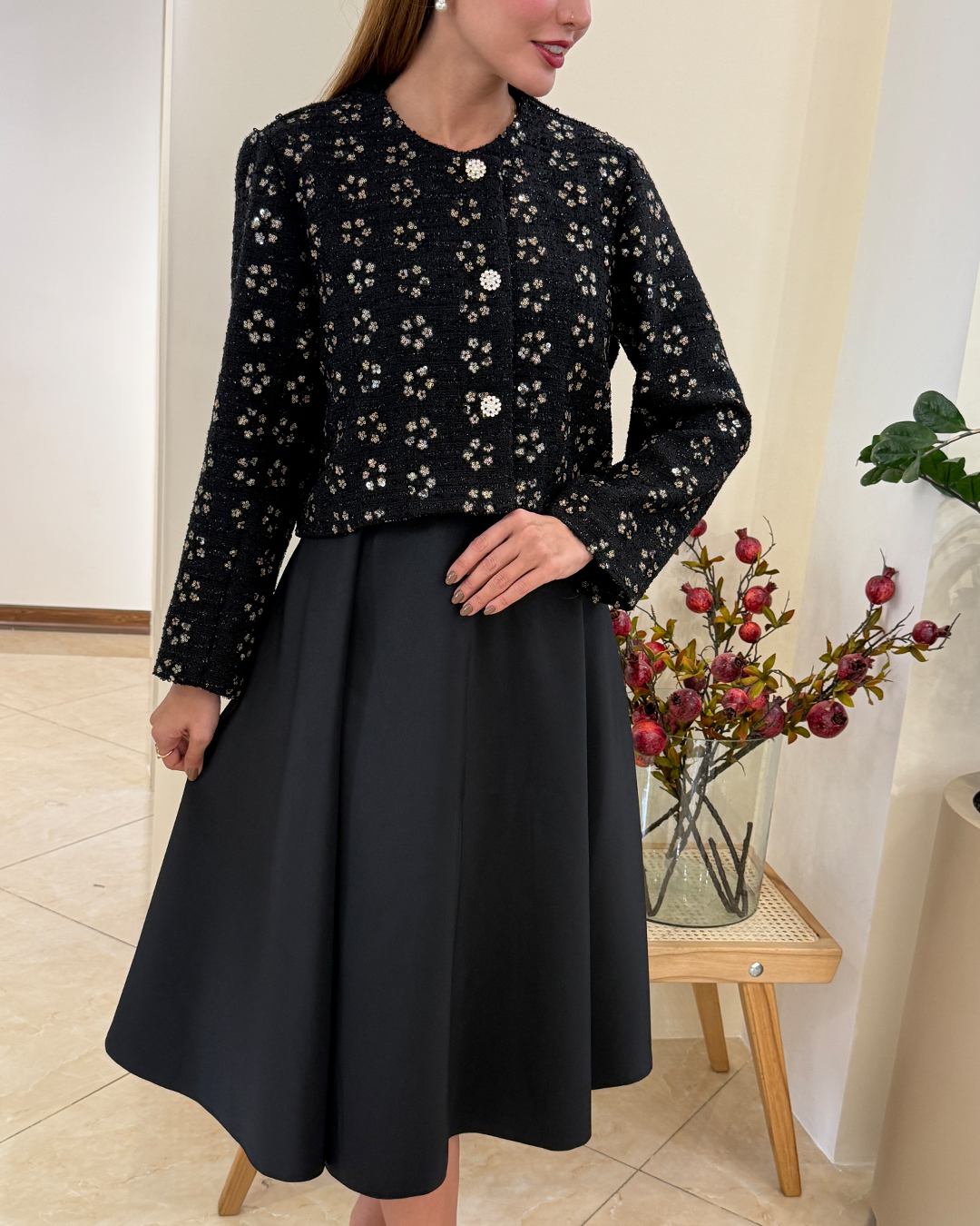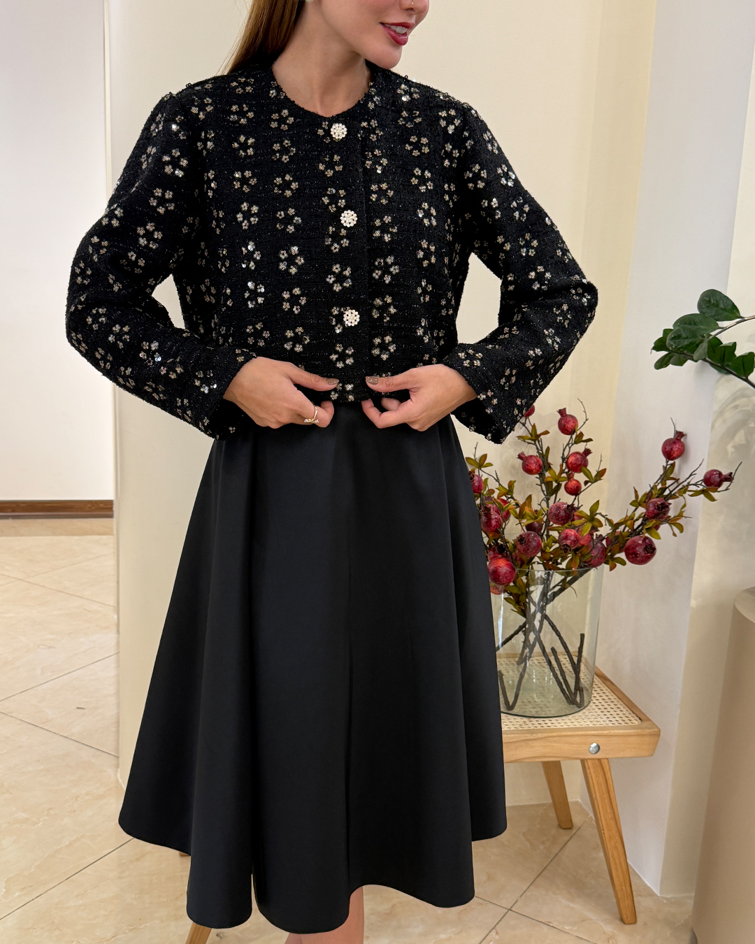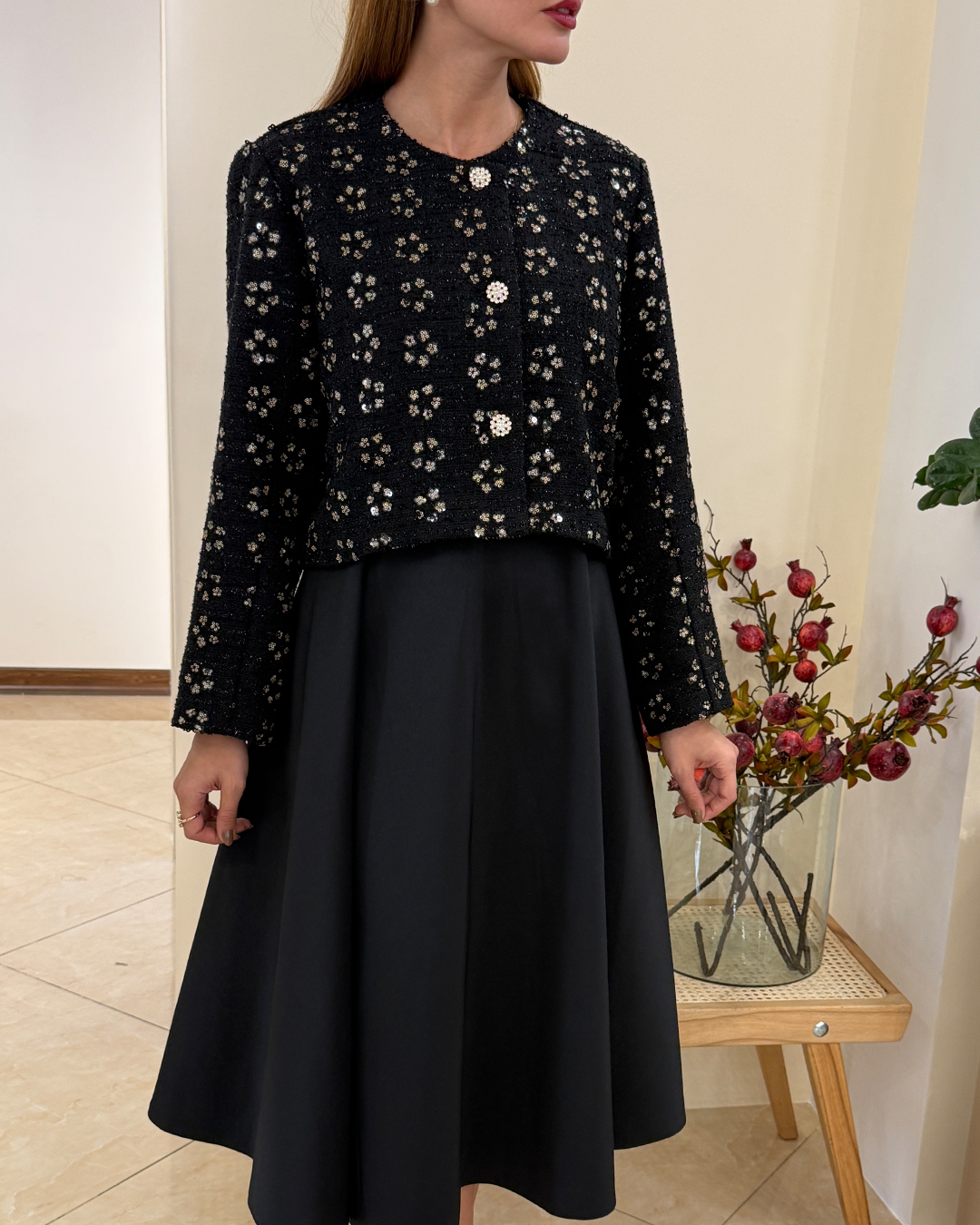 پترن این کت یکی از پرطرفدارترین طرح‌های گالری است و تداعی کننده حس ظرافت و دخترانه  است. استایل کردن این کت بسیار ساده است و پیراهن ساتن ساده در زیر این کت، پیشنهاد گالری نیلوفر شهرابی به شماست.