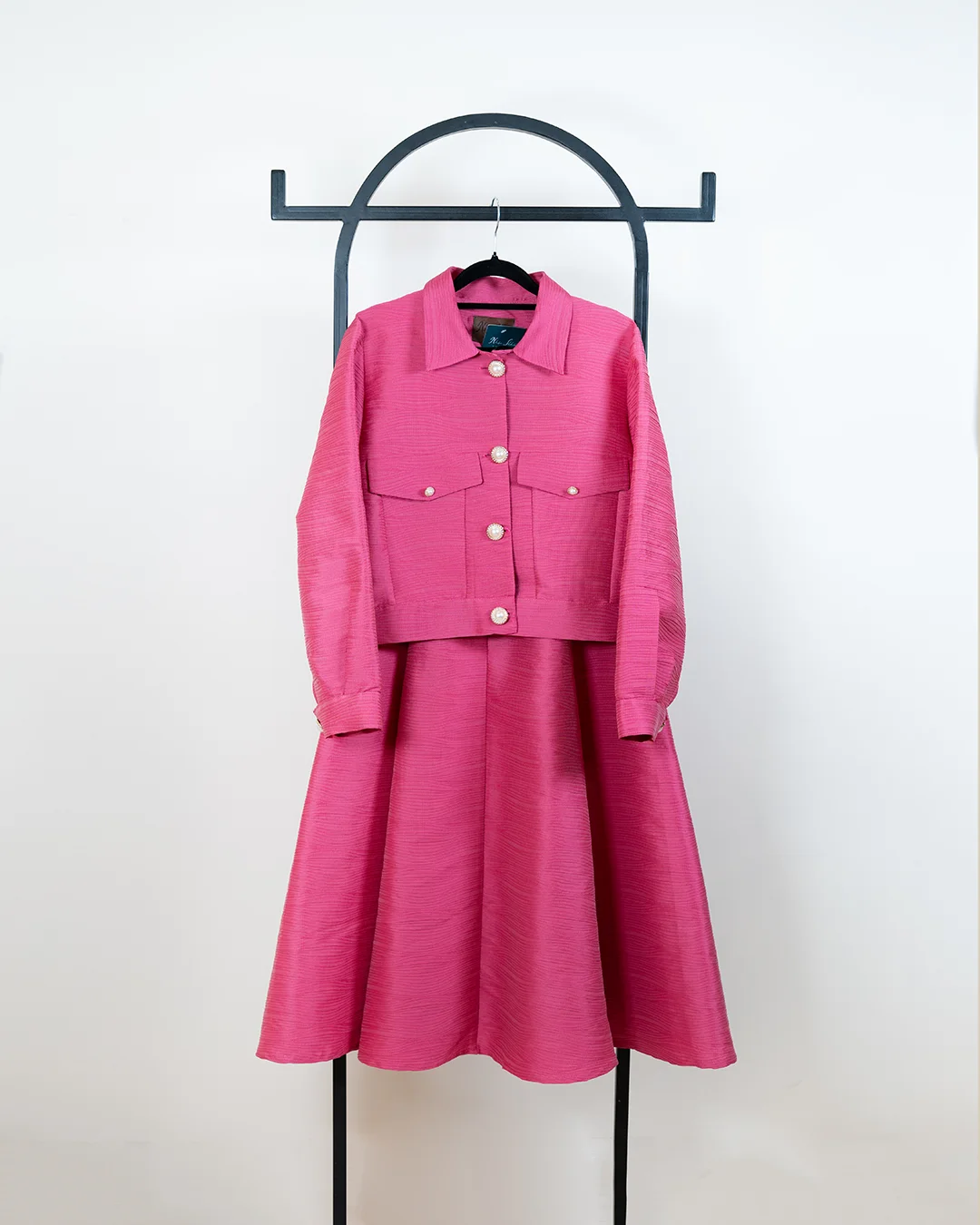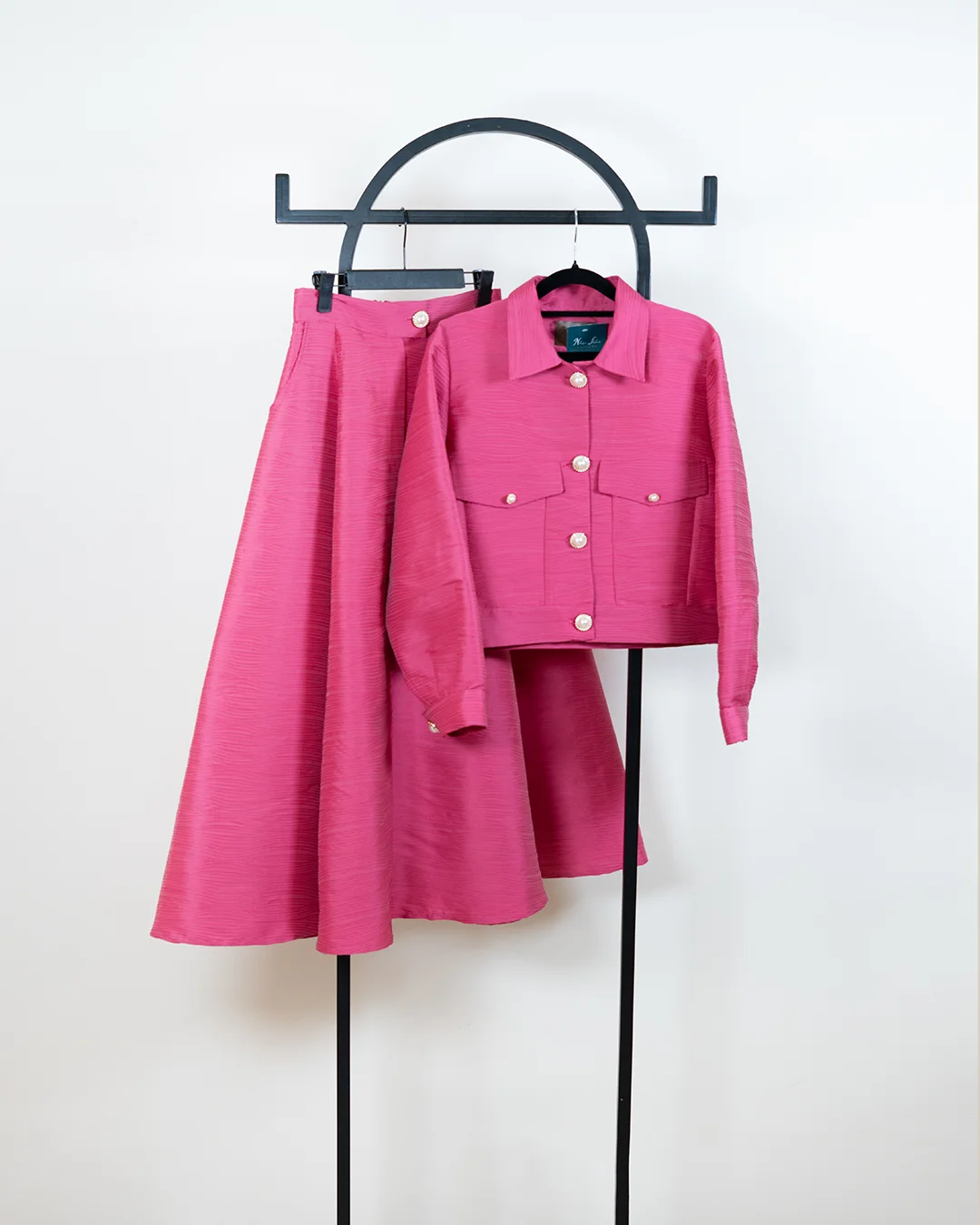 ست کت دامن ژاکارد ساده دکمه مروارید ، صورتی رگه دار