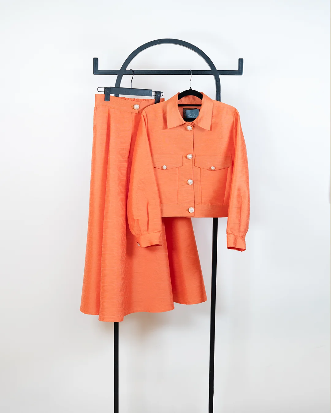 ست کت دامن ژاکارد ساده دکمه مروارید ، نارنجی رگه دار