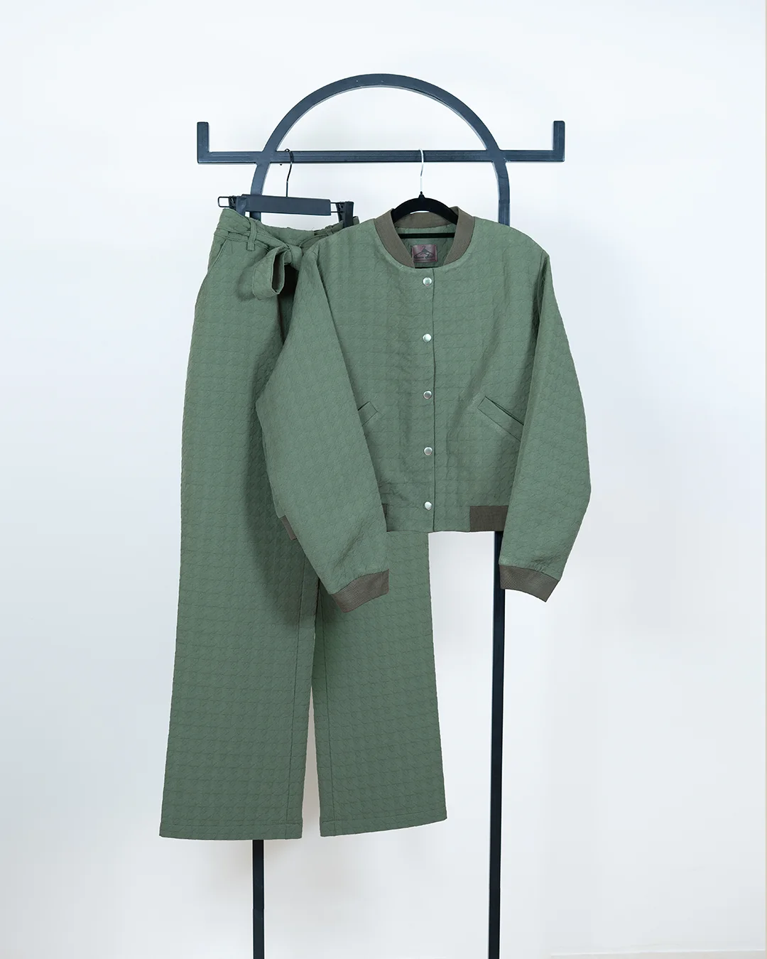 ست سوییشرت و شلوار بیسبالی ژاکارد سبز از گالری نیلوفر شهرابی، انتخابی ایدهآل برای خانمهایی است که به دنبال استایل اسپرت و در عین حال شیک هستند.